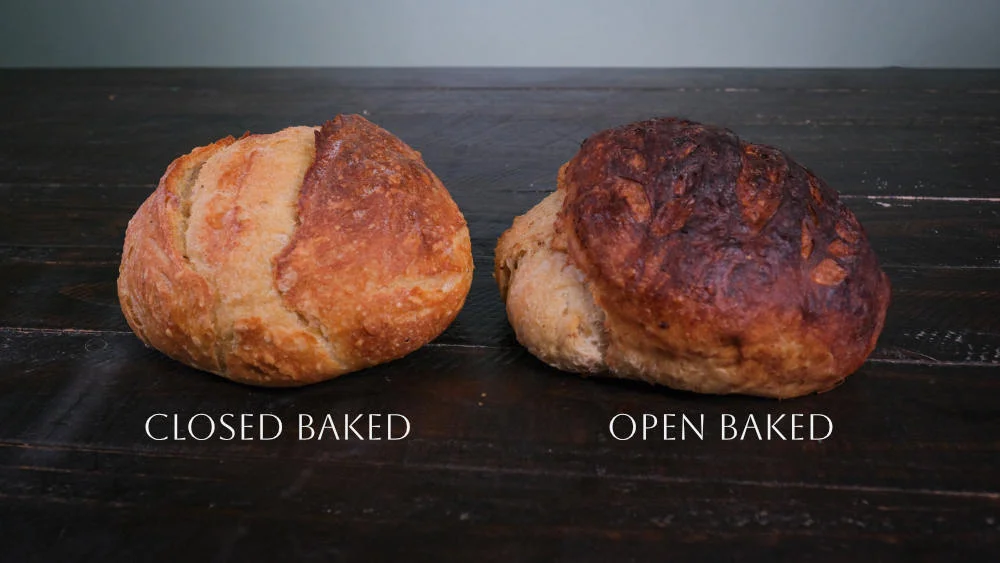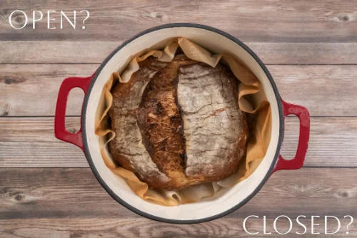 Closed bake: For a softer crust, you will bake with the lid on longer than with the lid off. Adjust until you get the desired texture of crust. Use a silicone sling to help with the bottom from burning. You are less likely to have the bottom explode out of the side when doing a closed bake method.